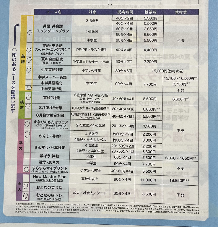幼児さんのお試しレッスンになる2回のコースから小学生、中学生のクラスも色々。大人の方のクラスや、漢検、英検R のコースもあります。